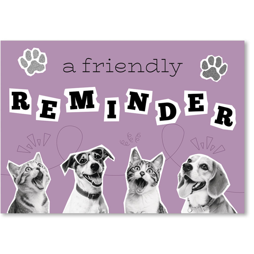 Send a friendly reminder about a pet's upcoming vet appointment with an appointment reminder card. Personalize it with your clinic name and a message. Individual postcard size is 6" x 4 1/4"